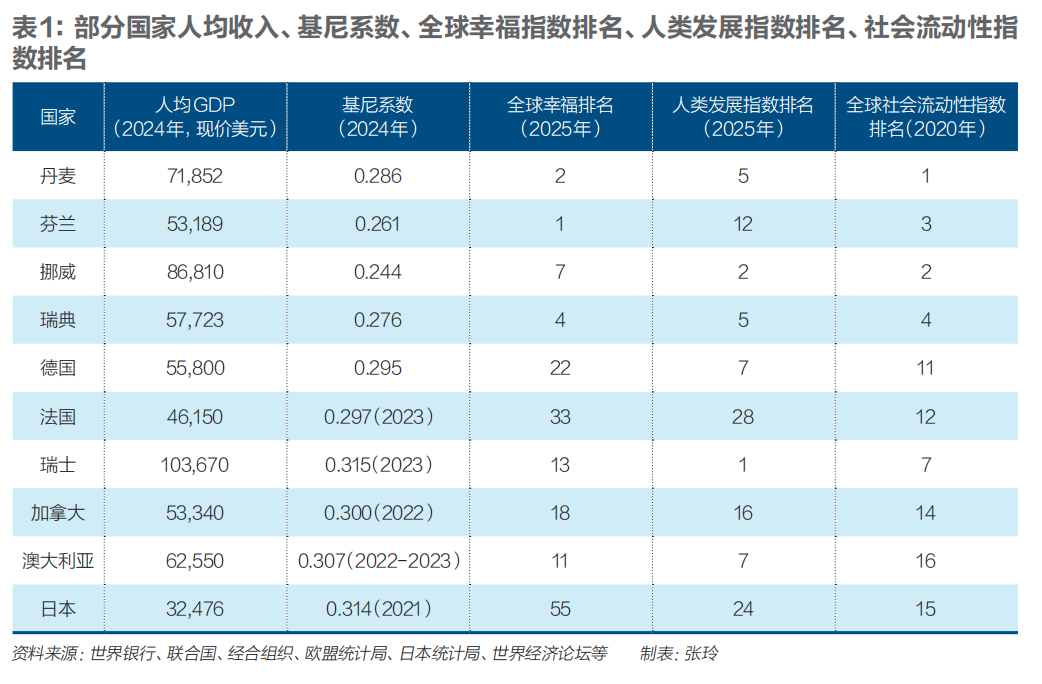 一般而言,基尼系数较高的国家多由“新自由主义”主导,美国便是这一模式的代表:其在创新驱动和市场活力等方面具有显著优势,但社会财富集中度高、收入差距明显,实现了富强但是没有实现共同富裕。而基尼系数相对较低的国家则往往属于高收入、高福利的“社会民主主义”型经济体,在制度安排上更接近于实现共同富裕的目标,例如部分西欧国家及澳大利亚、加拿大、日本等。