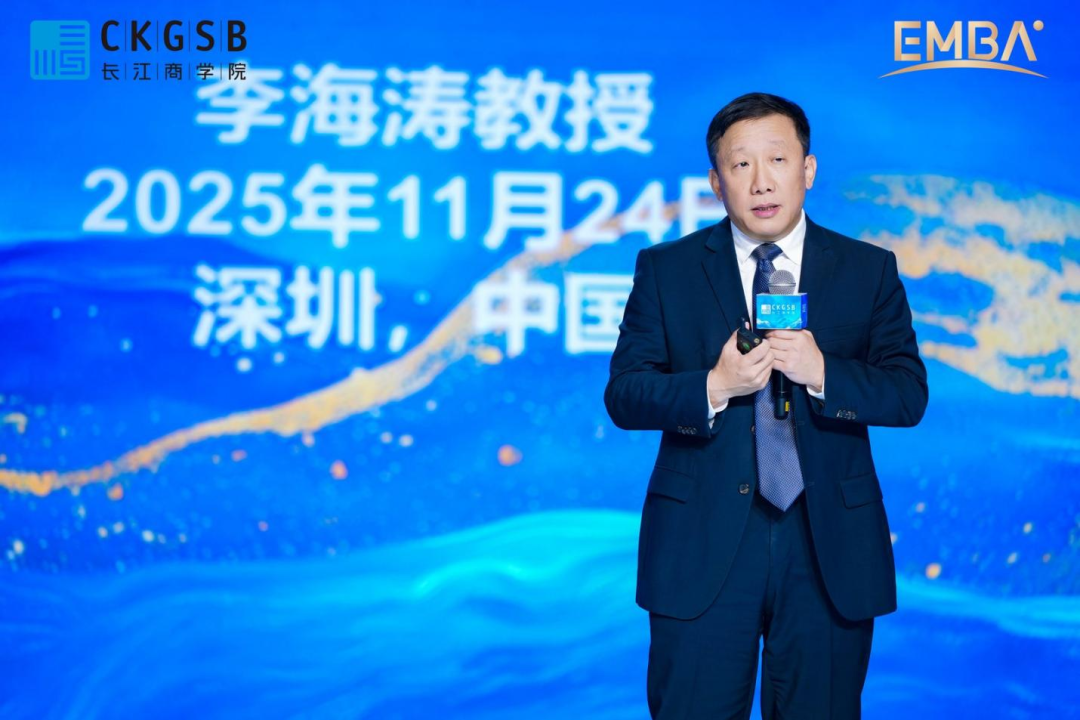 长江商学院院长、长江商学院金融学教授、杰出院长讲席教授、长江商学院教育发展基金会名誉理事长李海涛博士发表开场致辞。他紧扣2025年全球地缘格局重塑、技术革命深化、消费市场迭代三大关键趋势,为现场师生深入剖析了大变局下商业逻辑的重构路径,助力新生洞察趋势、把握未来。