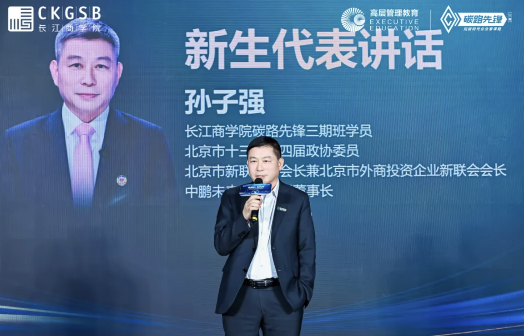 作为新生代表,长江商学院碳路先锋三期班同学、北京市十三、十四届政协委员、北京市新联会副会长兼北京市外商投资企业新联会会长、中鹏未来有限公司董事长孙子强分享了自己的入学感受。