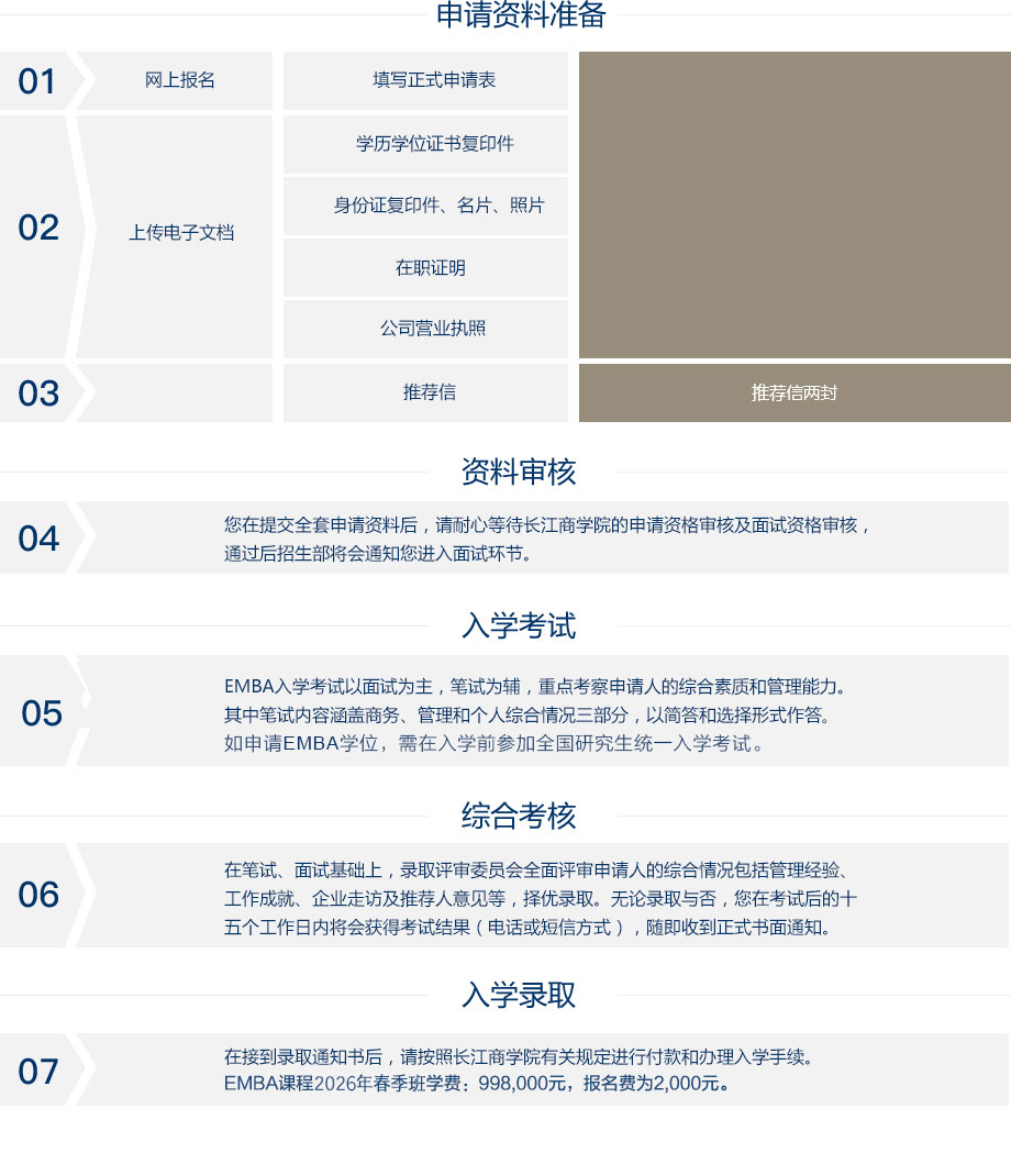 长江商学院EMBA将综合考察申请人的基本素质、教育背景、工作经历、团队精神和领导能力,择优录取。 为了保证学员能在长江商学院EMBA的学习过程中获得良好裨益,申请人必须具备以下基本条件: